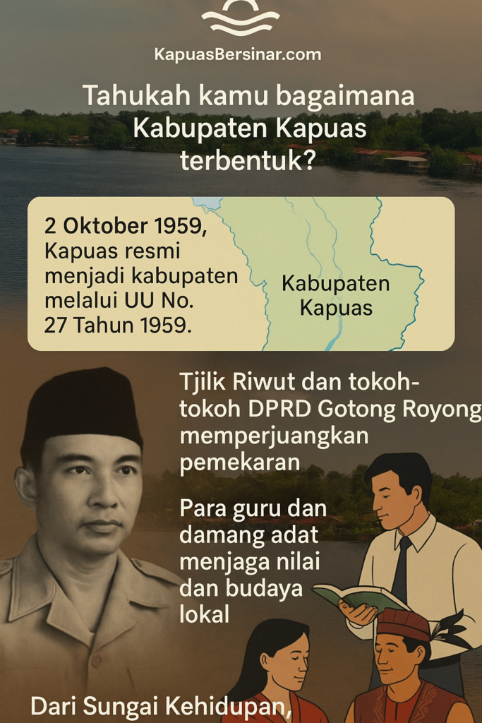 rubrikalteng.com/ – Walaupun belum banyak tercatat secara nasional, beberapa tokoh lokal memiliki peran penting dalam terbentuknya dan berkembangnya Kabupaten Kapuas:1. Tjilik RiwutGubernur pertama Kalimantan Tengah.Pejuang kemerdekaan dan tokoh Dayak nasional.Berperan penting dalam pembentukan Provinsi Kalimantan Tengah yang kemudian melahirkan Kabupaten Kapuas sebagai salah satu wilayah administratifnya.2. Para Tokoh DPRD Gotong Royong Era 1950-anMereka adalah anggota-anggota […]